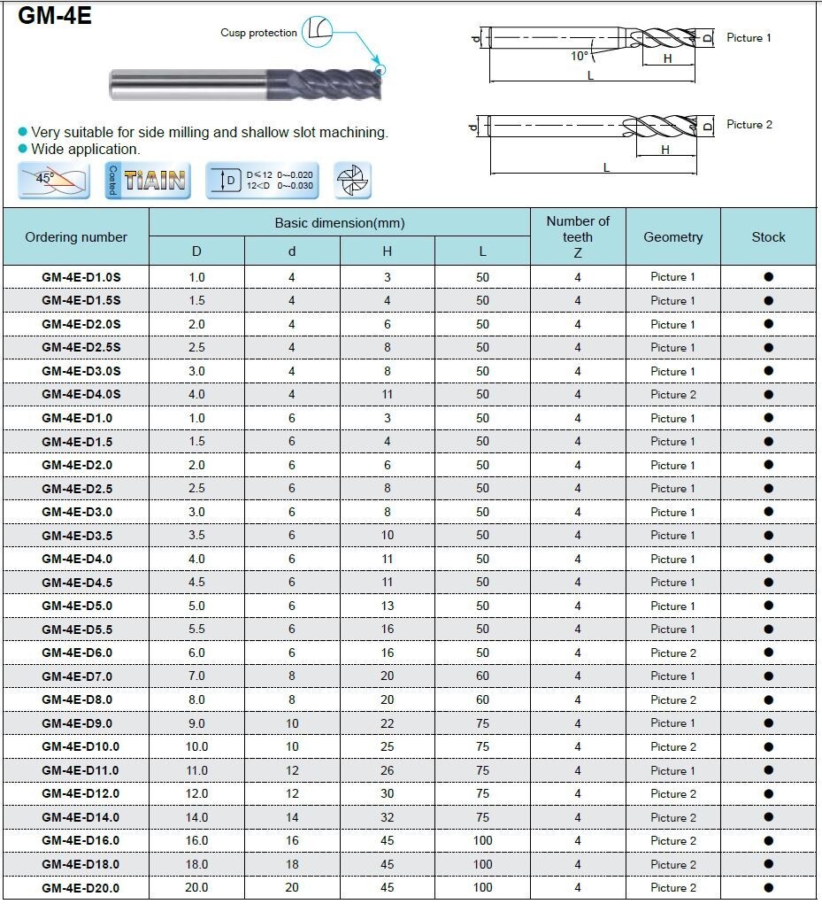 3mm HM Pinnfräs för stål 4-skär SKU: GM-4E-D3.0 Lagerstatus: 10 st 137,71 kr Moms: 34,43 kr Antal st Lägg i varukorgen Beskrivning Pinnfräs i hårdmetall för bearbetning av stålAntal skär 4stDiameter 3mmSkaft 6mmSkärlängd 8mmKatalog